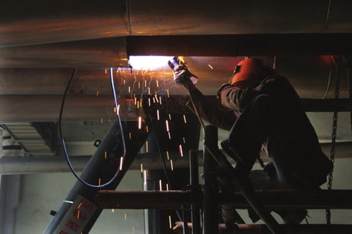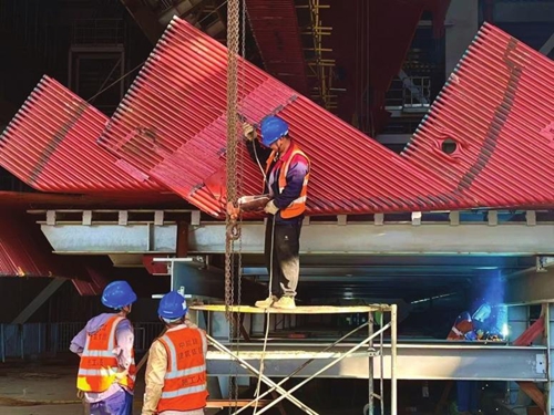而乐章中最华彩的部分,无疑是焊枪点亮的刹那——簇簇红色焊花如流星坠落,在钢板上熔出坚固的纹路,也映亮了劳动者专注的眼眸。
