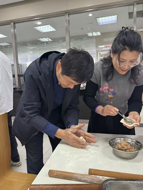 活动现场暖意融融,食堂内早已备齐面粉、馅料、擀面杖等各类食材工具,通过随机抽签分组,迅速组成多个“包子战队”。有过包包子经验的老员工主动站出来担任“技术总监”,手把手示范揉面的技巧,细致讲解捏褶的关键——“捏的时候要轻轻提,褶子要均匀,这样蒸出来才好看又入味”;初次尝试的“新手”们则围在一旁认真观摩,时而点头记要点,时而大胆上手尝试,即便捏出的包子形状各异,也引得众人善意欢笑。有的小组负责和面擀皮,节奏紧凑有序;有的小组专攻调馅调味,讨论得热火朝天;还有的小组专司“造型设计”,尝试做出花样褶皱。大家各司其职又互帮互助,遇到操作难题时主动搭手,成功做出满意作品时相互喝彩,食堂内的欢声笑语与面粉的麦香交织在一起,满是团结友爱的温情。
