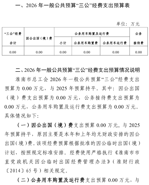 淮南市总工会2026年一般公共预算“三公”经费预算