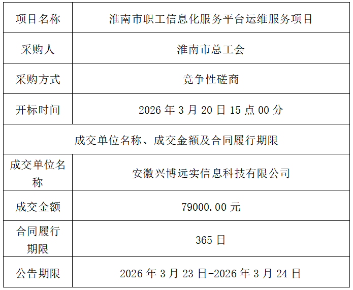 淮南市职工信息化服务平台运维服务项目(一次)成交结果公告